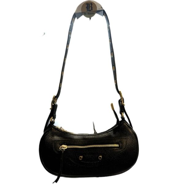 La Luna Noir è una mini bag in pelle nera dallo stile moderno e deciso. La sua silhouette a mezza luna è compatta ma di carattere, impreziosita da una zip centrale e due borchie decorative posizionate in modo simmetrico alla base.