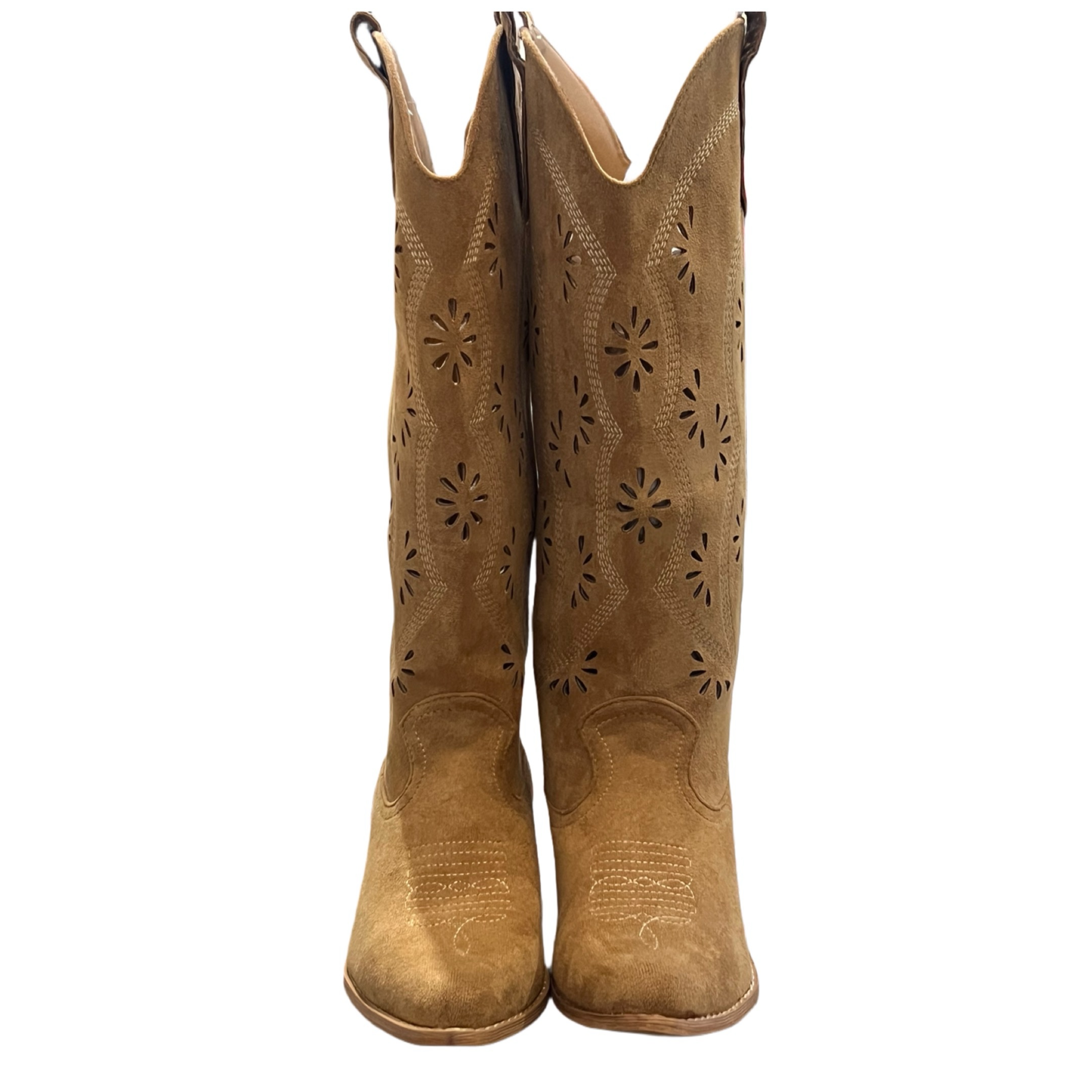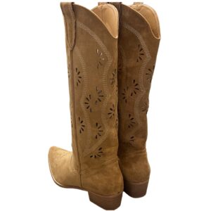 Dai un tocco di carattere ai tuoi outfit con questi splendidi stivali texani in morbido camoscio color caramello. La tomaia è arricchita da eleganti trafori floreali che richiamano la tradizione western, reinterpretata in chiave femminile e moderna. La silhouette slanciata e la punta affusolata donano un’allure decisa ma raffinata, perfetta da abbinare a vestiti svolazzanti, jeans skinny o gonne in denim.